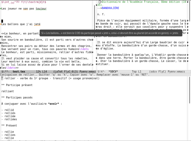 sdcv et flycheck-grammalecte définissent d’autres commandes pour par exemple conjuger un verbe, afficher la définition dans une fenêtre pop-up ,etc. (cf. la documentation de chacun de ces paquets).