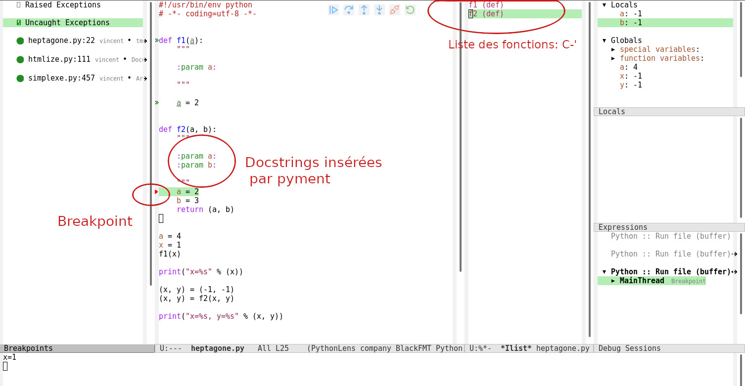 :hook (python-mode . python-docstring-mode) )Un menu avec les variables et la complétion de commande