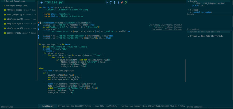 debugpy via le "debug adpatater protocol". Cela permet de transformer emacs en EDI et de bénéficier de service spécifique pour python développer initialement pour vscode. Les logiciels pyright et debugpy sont développés par Microsoft et placés sous licence MIT.