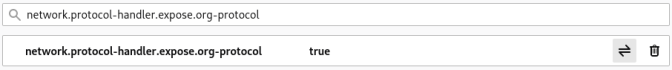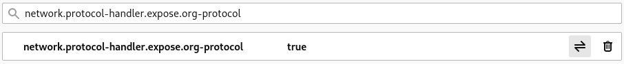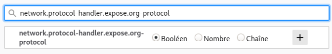 Puis créer une nouvelle clef network.protocol-handler.expose.org-protocol de type boolean et assigner lui la valeur True.