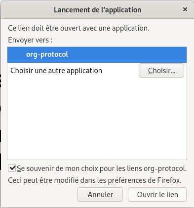 Lors de la première capture, il faut lier les deux : les liens org-protocol sont à ouvrir avec org-protocol.desktop.