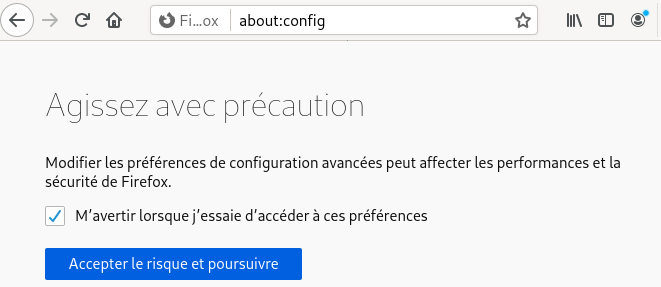 Saisir about:config dans la barre d’adresse et accepter de faire attention.